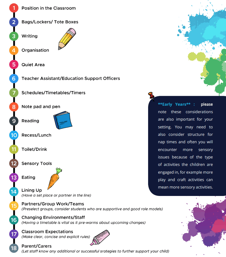 Many students require sensory tools to focus, process or calm. You will probably need to provide a range of sensory tools for the student. This may include a sensory mat to sit on, fidget tools, chewy necklaces, tubes or pencil toppers (see resources at: https://suelarkey.com.au/sensory-shop/)