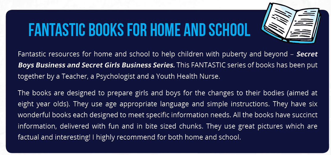 Puberty is part of natural development for all children. Puberty usually starts in girls around 10-11 and boys 11-12. Menstruation for girls typically occurs between 12 and 13, while voice changes for boys is often around 15. We ALL need to have on-going discussions with the child and this is where having both home and school helping the child’s understanding is vital. Boys and girls need to know about their changes and changes in the opposite sex too (particularly, if they have opposite sex siblings or are at co-ed schools). It is important to start sharing this information with them before the changes occur otherwise the children may worry that something is wrong with them. I know some parents who talk about the changes before they happen and then as they happen their children tell them and they celebrate!