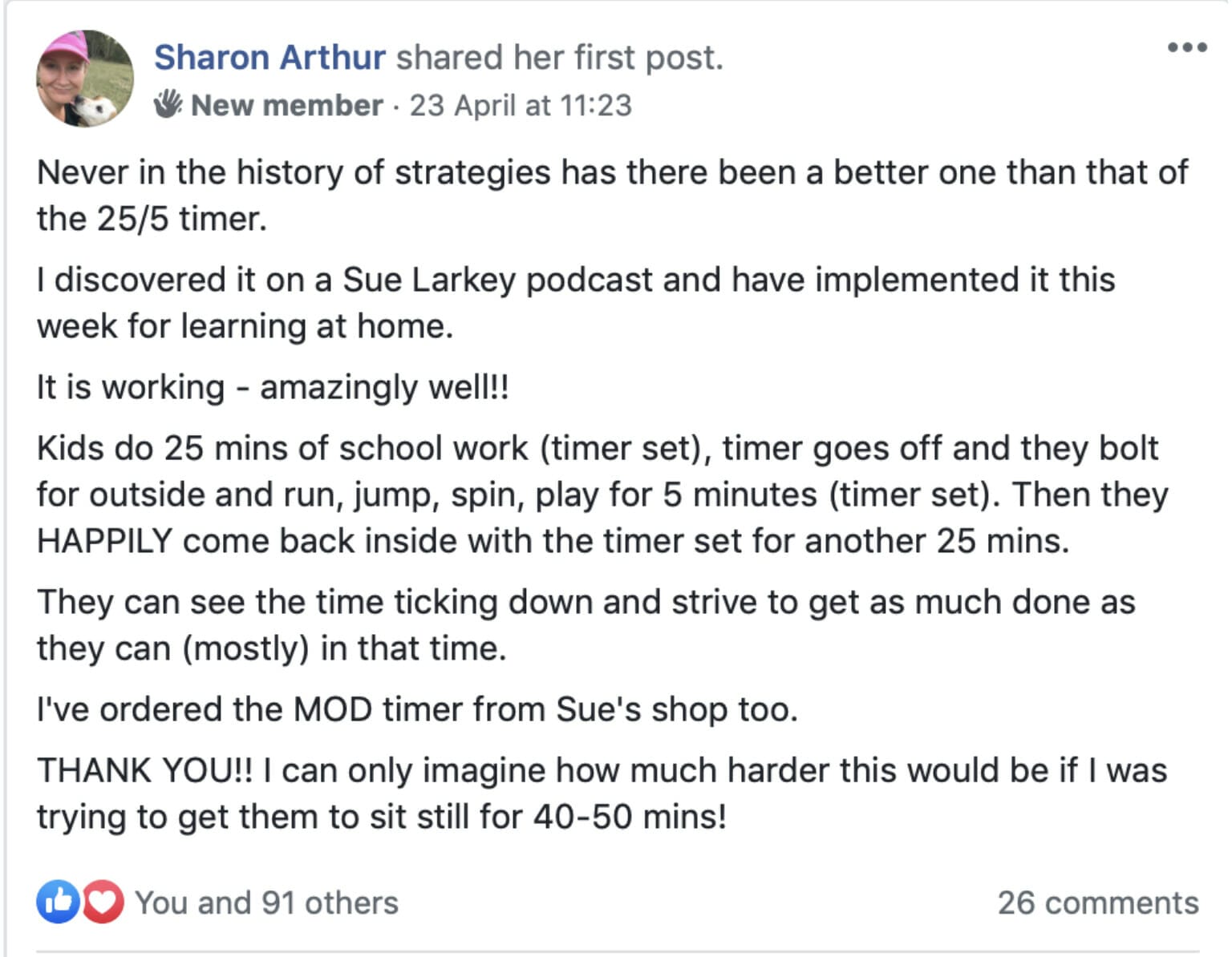 21. Many students lose track of time when they are doing something they love. Often they do not have an end point or they want to repeat the activity. Timers create a finish point.